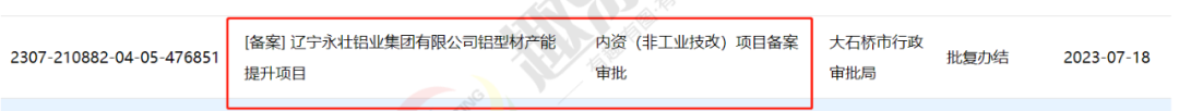 2023年7月18日,遼寧永壯鋁業(yè)集團(tuán)有限公司,鋁型材產(chǎn)能提升項(xiàng)目,在大石橋市行政審批局,進(jìn)行內(nèi)資(非工業(yè)技改)項(xiàng)目備案審批。
