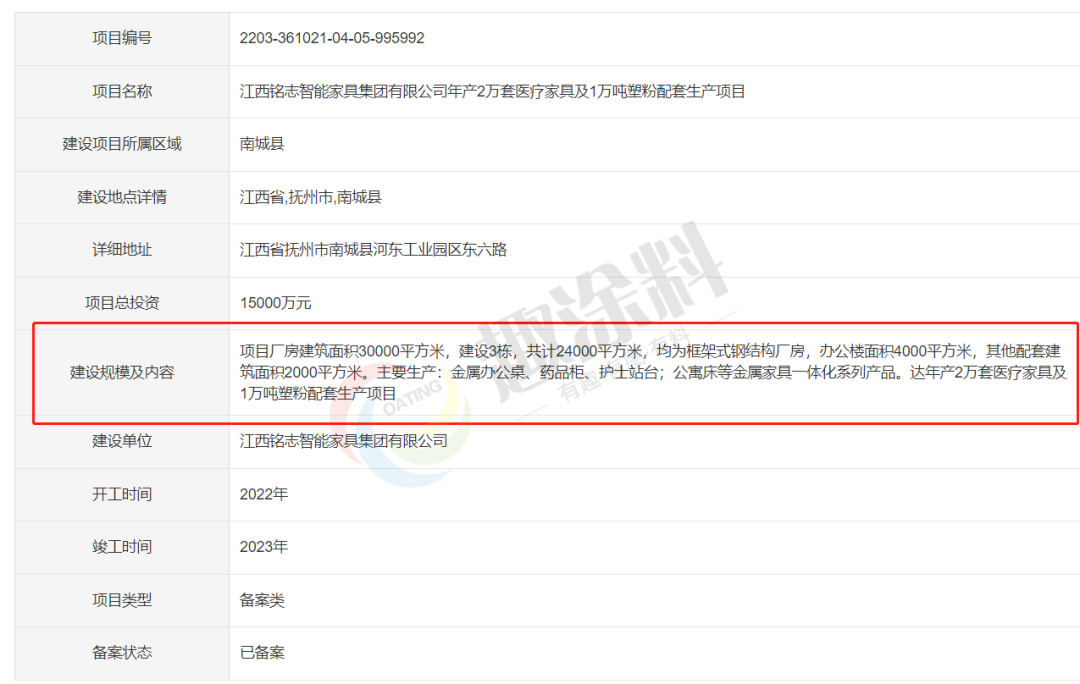 2023年7月14日,江西銘志智能家具集團有限公司,年產2萬套醫(yī)療家具及1萬噸塑粉配套生產項目,進行企業(yè)項目備案。