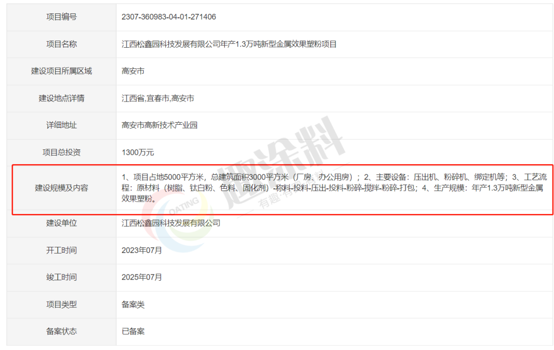 2023年7月12日,江西松鑫園科技發(fā)展有限公司,年產1.3萬噸新型金屬效果塑粉項目,進行企業(yè)項目備案。
