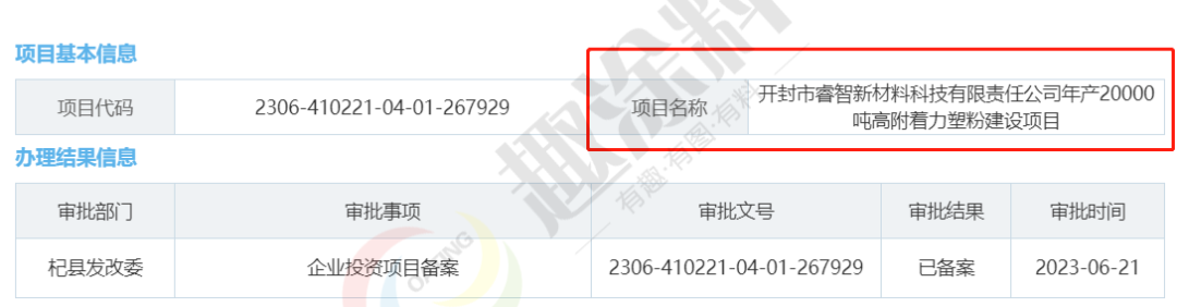 2023年6月21日,開封市睿智新材料科技有限責任公司,年產20000噸高附著力塑粉建設項目,在杞縣發(fā)改委,進行企業(yè)投資項目備案。