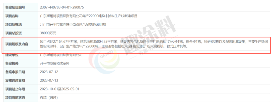 2023年7月13日,廣東斯耐特項目投資有限公司,年產22000噸粉末涂料生產線新建項目,在開平市發(fā)展和改革局,進行企業(yè)項目備案。