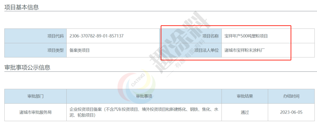2023年6月5日,諸城市寶祥粉末涂料廠,寶祥年產500噸塑粉項目,在諸城市審批服務局,進行企業(yè)投資項目備案(不含汽車投資項目、境外投資項目和新建煉化、鋼鐵、焦化、水泥、輪胎項目)。