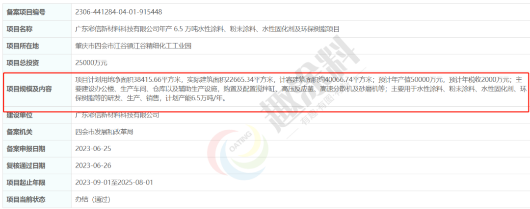 2023年6月26日,廣東彩信新材料科技有限公司,年產 6.5 萬噸水性涂料、粉末涂料、水性固化劑及環(huán)保樹脂項目,在四會市發(fā)展和改革局,進行企業(yè)項目備案。