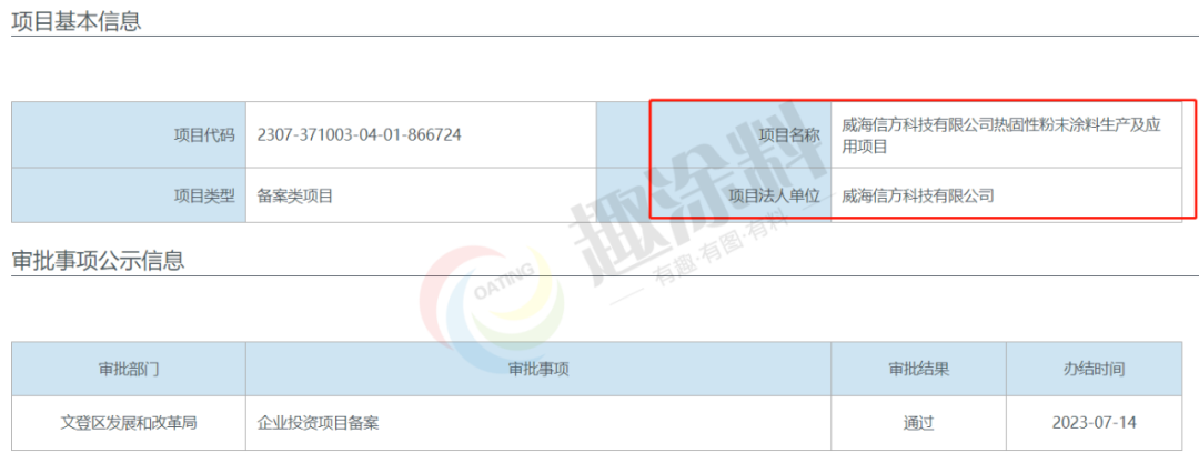2023年7月14日,威海信方科技有限公司,熱固性粉末涂料生產及應用項目,在文登區(qū)發(fā)展和改革局,進行企業(yè)投資項目備案。