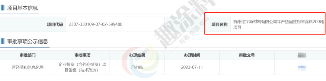 2023年7月11日,杭州銘宇新材料有限公司,年產熱固性粉末涂料200噸項目,在區(qū)經濟和信息化局,進行企業(yè)投資(含外商投資)項目備案(技術改造)。