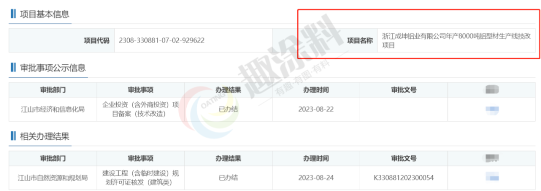 2023年8月22日,浙江成坤鋁業(yè)有限公司,年產(chǎn)8000噸鋁型材生產(chǎn)線技改項(xiàng)目,在江山市經(jīng)濟(jì)和信息化局,進(jìn)行企業(yè)投資(含外商投資)項(xiàng)目備案(技術(shù)改造)。