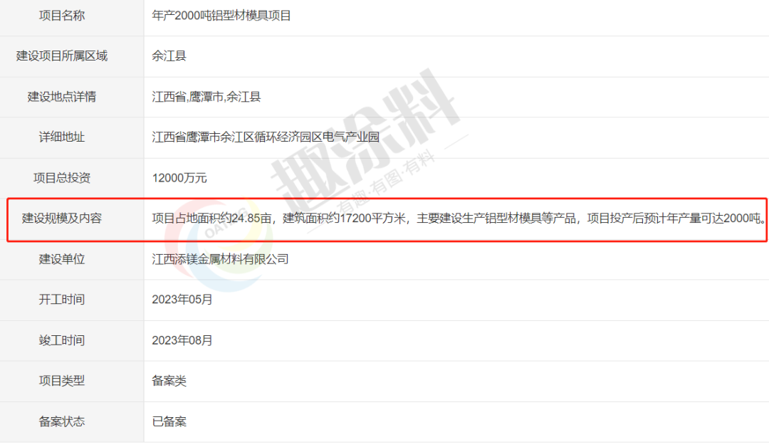 2023年8月18日,江西添鎂金屬材料有限公司,年產(chǎn)2000噸鋁型材模具項(xiàng)目,進(jìn)行企業(yè)投資項(xiàng)目備案。