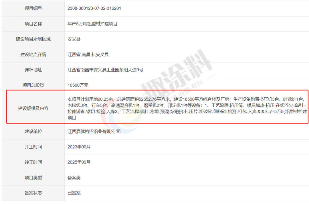 2023年8月17日,江西嘉優(yōu)格鋁鋁業(yè)有限公司,年產(chǎn)5萬噸鋁型材擴(kuò)建項(xiàng)目,進(jìn)行企業(yè)投資項(xiàng)目備案。