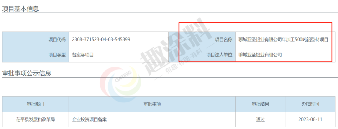 2023年8月11日,聊城亞圣鋁業(yè)有限公司,年加工500噸鋁型材項(xiàng)目,在茌平縣發(fā)展和改革局,進(jìn)行企業(yè)投資項(xiàng)目備案。