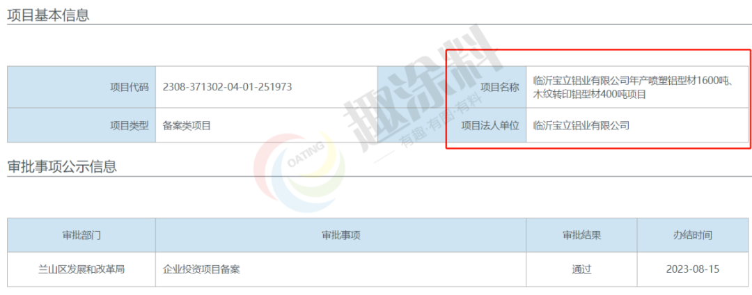 2023年8月11日,臨沂寶立鋁業(yè)有限公司,年產(chǎn)噴塑鋁型材1600噸、木紋轉(zhuǎn)印鋁型材400噸項(xiàng)目,在蘭山區(qū)發(fā)展和改革局,進(jìn)行企業(yè)投資項(xiàng)目備案。