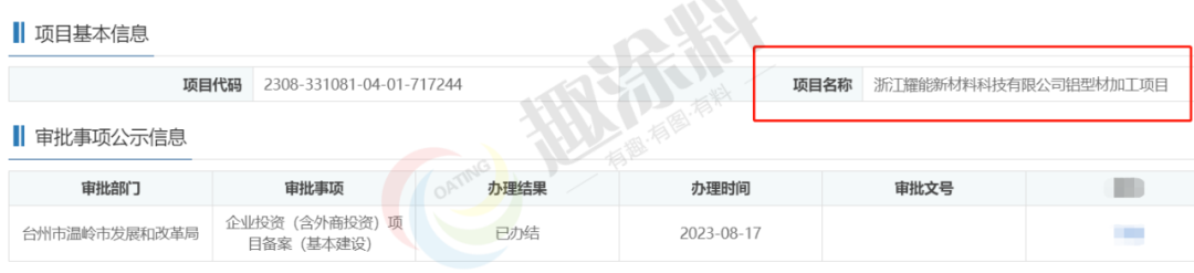 2023年8月17日,浙江耀能新材料科技有限公司,鋁型材加工項(xiàng)目,在臺(tái)州市溫嶺市發(fā)展和改革局,進(jìn)行企業(yè)投資(含外商投資)項(xiàng)目備案(基本建設(shè))。