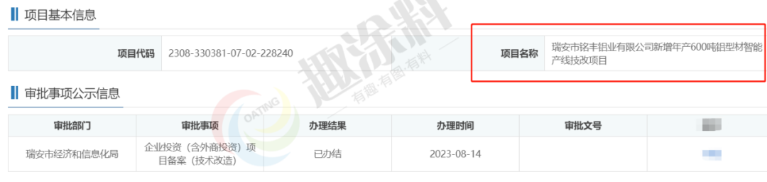 2023年8月14日,瑞安市銘豐鋁業(yè)有限公司,新增年產(chǎn)600噸鋁型材智能產(chǎn)線技改項(xiàng)目,在瑞安市經(jīng)濟(jì)和信息化局,進(jìn)行企業(yè)投資(含外商投資)項(xiàng)目備案(技術(shù)改造)。