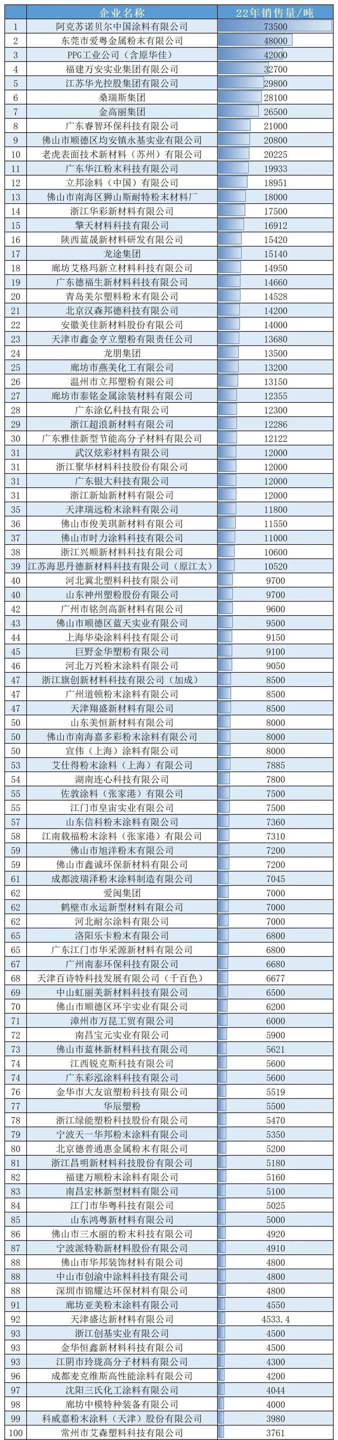 同月,由趣涂料(趣涂網(wǎng))主辦,正杰集團(tuán)冠名的“2023粉末涂料百?gòu)?qiáng)企業(yè)”榜單正式揭曉榜單。粉末涂料企業(yè)百?gòu)?qiáng)是按照2022年粉末涂料銷售量來(lái)排名的,排進(jìn)前10名的企業(yè)有:福建萬(wàn)安實(shí)業(yè)集團(tuán)有限公司(3.27萬(wàn)噸)、江蘇華光控股集團(tuán)有限公司(2.98萬(wàn)噸)、桑瑞斯集團(tuán)(2.81萬(wàn)噸)、金高麗集團(tuán)(2.65萬(wàn)噸)、廣東睿智環(huán)??萍加邢薰荆?.1萬(wàn)噸)、佛山市順德區(qū)均安鎮(zhèn)永基實(shí)業(yè)有限公司(2.08萬(wàn)噸)、老虎表面技術(shù)新材料(蘇州) 有限公司(2.0225萬(wàn)噸)。