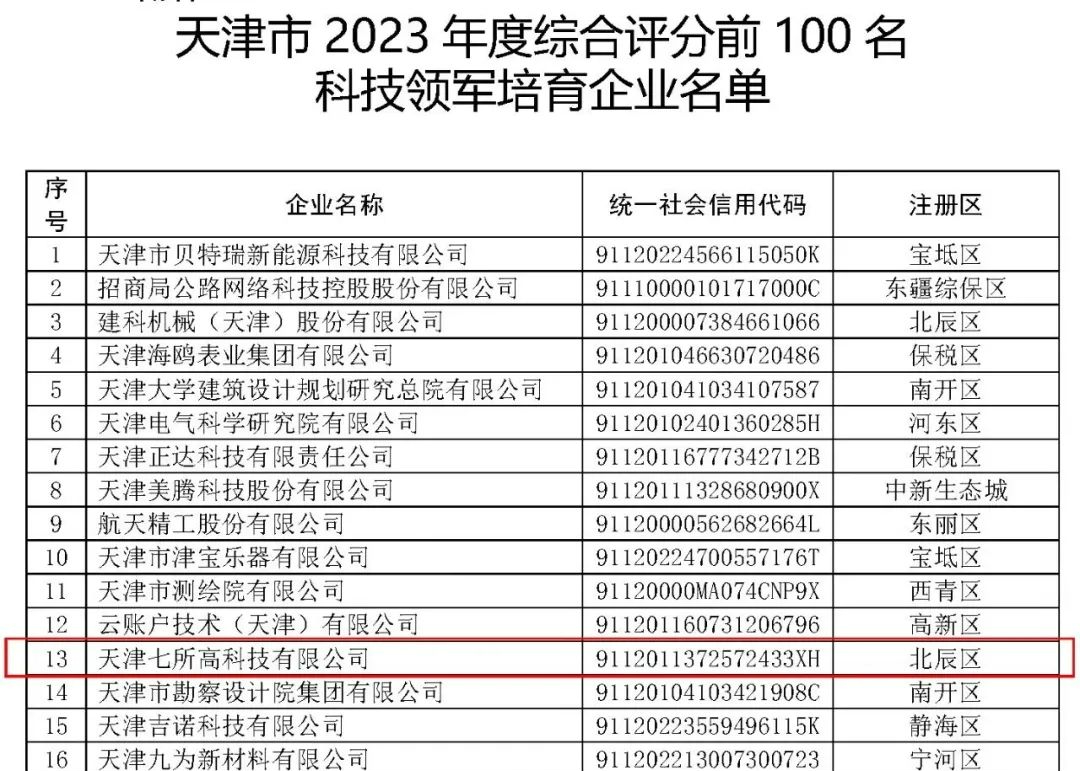 近日,天津市科技局網(wǎng)站發(fā)布《天津市2023年度綜合評分前100名雛鷹企業(yè)、瞪羚企業(yè)、科技領(lǐng)軍培育企業(yè)和科技領(lǐng)軍企業(yè)名單的公告》,七所高科位列科技領(lǐng)軍培育企業(yè)第13名。此次公告的各類企業(yè)前100名是根據(jù)企業(yè)2022年度營業(yè)收入、利潤、納稅、科技量化積分等指標(biāo),對2023年入庫的天津市雛鷹企業(yè)、瞪羚企業(yè)、科技領(lǐng)軍培育企業(yè)和科技領(lǐng)軍企業(yè)進(jìn)行了綜合評分。