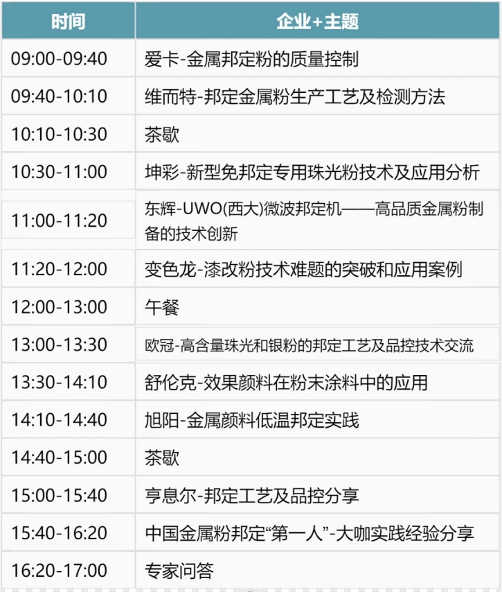 為了給粉末涂料制造企業(yè)提供行業(yè)最佳實(shí)踐經(jīng)驗(yàn),會議邀請了國內(nèi)國外在相關(guān)領(lǐng)域比較有影響力的企業(yè)和專家。他們將給大家從原材料選擇,設(shè)備選型,工藝適配,安全生產(chǎn),技術(shù)技巧和品質(zhì)管控等全方位培訓(xùn)邦定金屬粉可能涉及的知識點(diǎn),經(jīng)驗(yàn)分享和卡點(diǎn)解決方案。同時場外還有眾多金屬顏料和邦定設(shè)備生產(chǎn)企業(yè)提供他們的產(chǎn)品和解決方法供大家參考和借鑒。