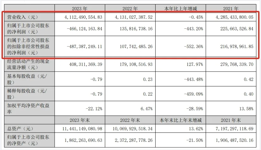 2023年,百川股份實現(xiàn)營業(yè)收入41.12億元,同比下滑0.45%;實現(xiàn)凈利潤-4.66億元,同比下滑443.2%;實現(xiàn)扣非后凈利潤-4.87億元,同比下滑552.36%。
