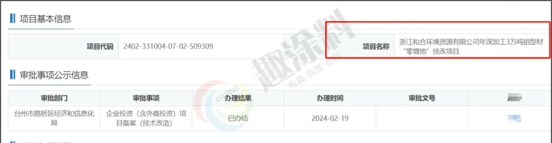 2024年2月19日,浙江和合環(huán)境資源有限公司,年深加工3萬噸鋁型材“零增地”技改項目,在臺州市路橋區(qū)經(jīng)濟和信息化局,進行企業(yè)投資(含外商投資)項目備案(技術(shù)改造)。