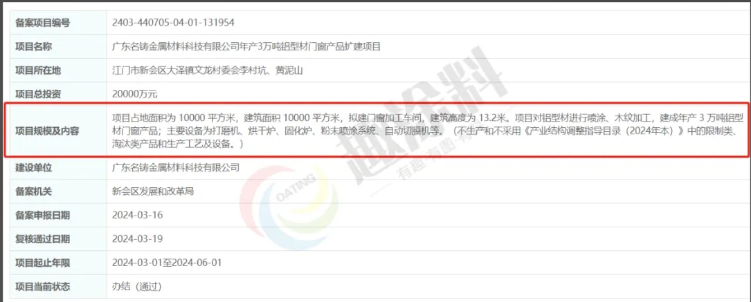 2024年3月16日,廣東名鑄金屬材料科技有限公司,年產(chǎn)3萬噸鋁型材門窗產(chǎn)品擴建項目,在新會區(qū)發(fā)展和改革局,進行企業(yè)項目備案。