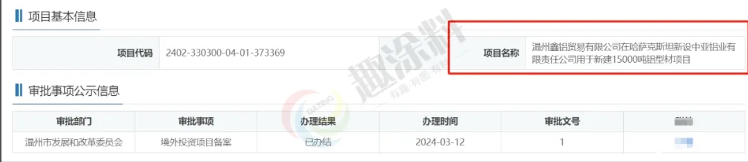 2024年3月15日,溫州鑫鋁貿(mào)易有限公司,在哈薩克斯坦新設(shè)中亞鋁業(yè)有限責(zé)任公司用于新建15000噸鋁型材項目,在溫州市發(fā)展和改革委員會,進行境外投資項目備案。