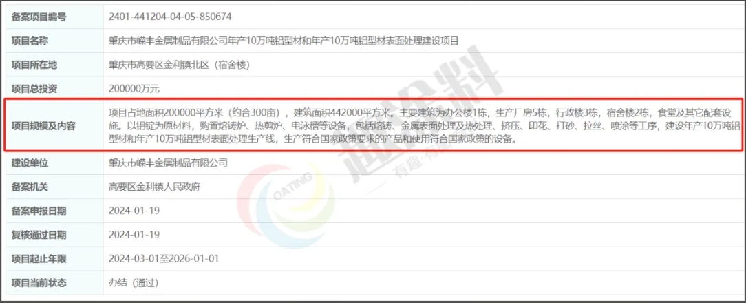 2024年1月19日,肇慶市嶸豐金屬制品有限公司,年產(chǎn)10萬噸鋁型材和年產(chǎn)10萬噸鋁型材表面處理建設(shè)項目,進行企業(yè)投資項目備案。