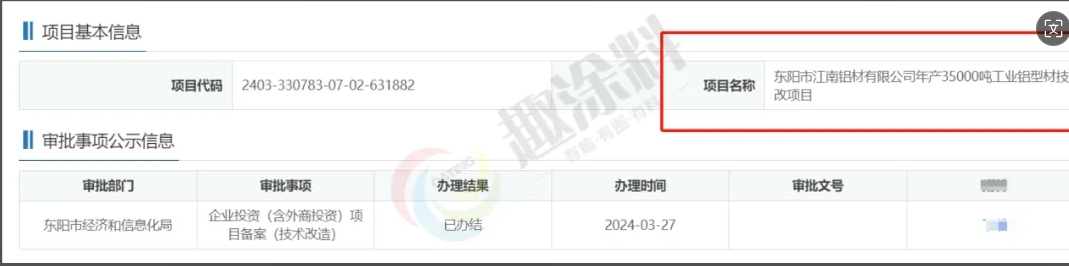 2024年3月27日,東陽市江南鋁材有限公司,年產(chǎn)35000噸工業(yè)鋁型材技改項目,在東陽市經(jīng)濟和信息化局,進行企業(yè)投資(含外商投資)項目備案(技術(shù)改造)。
