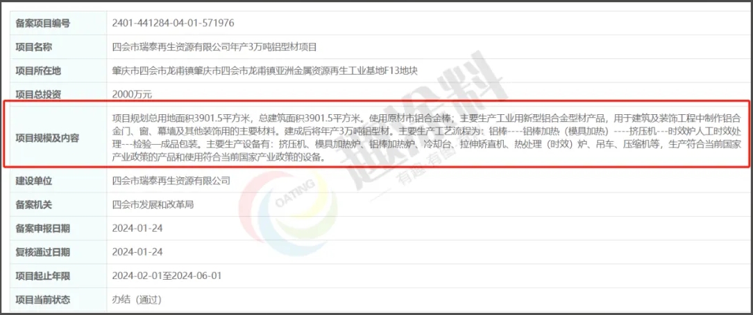 2024年1月24日,四會市瑞泰再生資源有限公司,年產(chǎn)3萬噸鋁型材項目,在四會市發(fā)展和改革局,進行企業(yè)項目備案。
