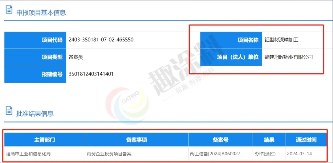 2024年3月14日,福建旭暉鋁業(yè)有限公司,鋁型材深精加工,在福清市工業(yè)和信息化局,進行內(nèi)資企業(yè)投資項目備案。