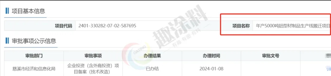 2024年1月8日,寧波晟鴻金屬制品有限公司,年產(chǎn)5000噸鋁型材制品生產(chǎn)線搬遷項目,在慈溪市經(jīng)濟和信息化局,進行企業(yè)投資(含外商投資)項目備案(技術(shù)改造)。