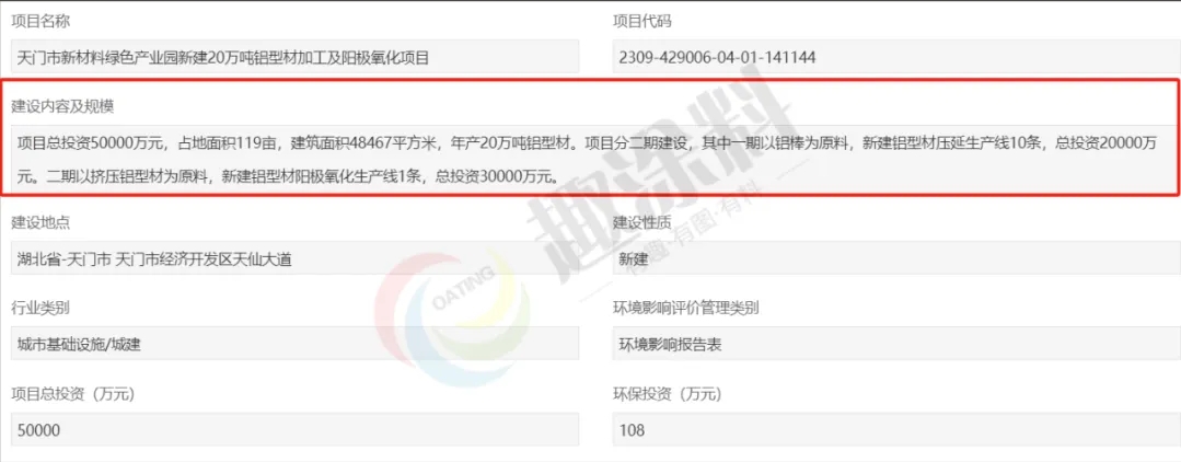 2024年1月24日,湖北立銘鋁業(yè)科技有限公司,天門市新材料綠色產(chǎn)業(yè)園新建20萬噸鋁型材加工及陽極氧化項目,在天門市生態(tài)環(huán)境局受理。