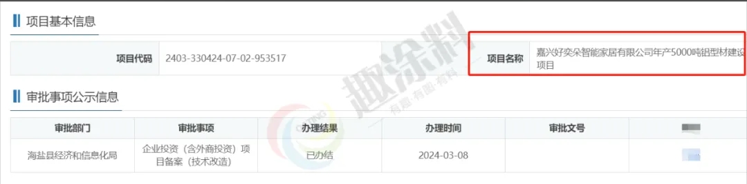 2024年3月8日,嘉興好奕朵智能家居有限公司,年產(chǎn)5000噸鋁型材建設(shè)項目,在海鹽縣經(jīng)濟和信息化局,進行企業(yè)投資(含外商投資)項目備案(技術(shù)改造)。