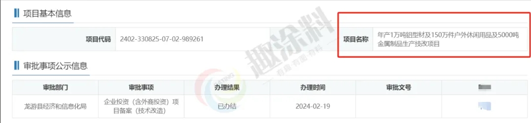 2024年2月19日,浙江錦煌金屬制品有限公司,年產(chǎn)1萬噸鋁型材及150萬件戶外休閑用品及5000噸金屬制品生產(chǎn)技改項目,在龍游縣經(jīng)濟和信息化局,進行企業(yè)投資(含外商投資)項目備案(技術(shù)改造)。