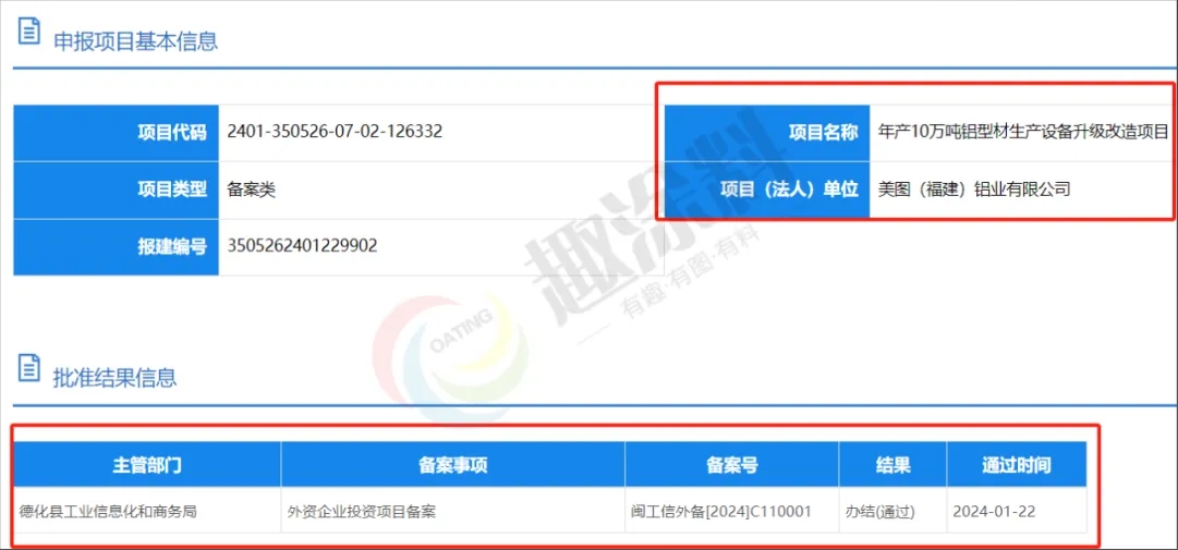 2024年1月22日,美圖(福建)鋁業(yè)有限公司,年產(chǎn)10萬噸鋁型材生產(chǎn)設(shè)備升級改造項目,在德化縣工業(yè)信息化和商務(wù)局,進行外資企業(yè)投資項目備案。