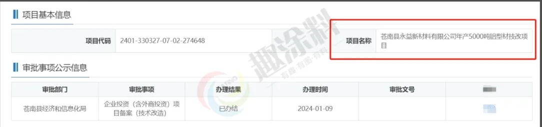 2024年1月9日,蒼南縣永益新材料有限公司,年產(chǎn)5000噸鋁型材技改項目,在蒼南縣經(jīng)濟和信息化局,進行企業(yè)投資(含外商投資)項目備案(技術(shù)改造)。