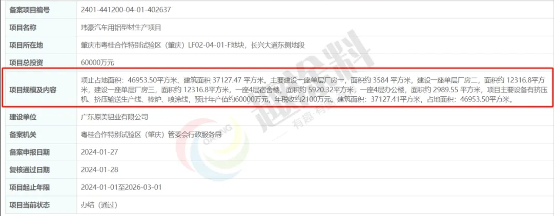 2024年1月28日,廣東原美鋁業(yè)有限公司,瑋豪汽車用鋁型材生產(chǎn)項目,在粵桂合作特別試驗區(qū)(肇慶)管委會行政服務(wù)局,進行企業(yè)項目備案。