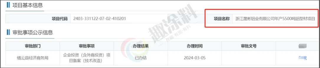2024年3月5日,浙江晟彬鋁業(yè)有限公司,年產(chǎn)5500噸鋁型材項目,在縉云縣經(jīng)濟商務(wù)局,進行企業(yè)投資(含外商投資)項目備案(技術(shù)改造)。