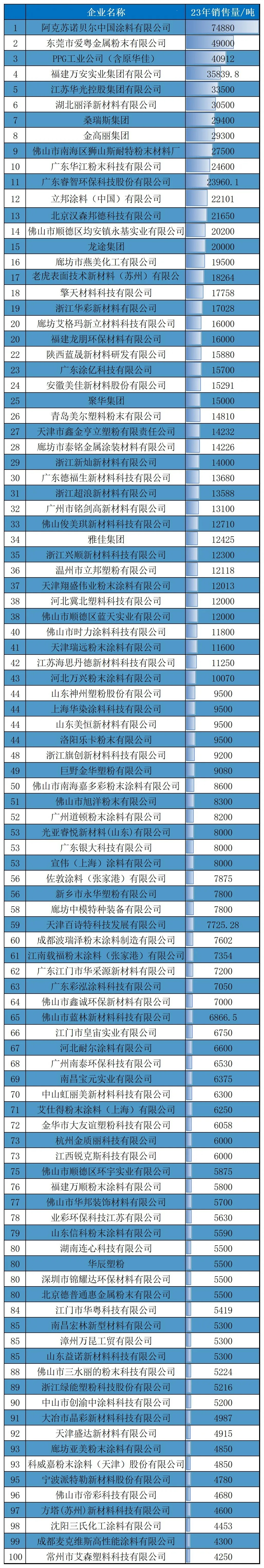 關(guān)于榜單的前五名,似乎早已成為定論。和上一年度一樣,阿克蘇諾貝爾中國涂料有限公司(2023年銷售量74880噸,下同)、東莞市愛粵金屬粉末有限公司(49000噸)、PPG工業(yè)公司(含原華佳)(40912噸)、福建萬安實(shí)業(yè)集團(tuán)有限公司(35839.8噸)、江蘇華光控股集團(tuán)有限公司(33500噸)這五大粉末涂料企業(yè)穩(wěn)穩(wěn)占據(jù)前五的寶座,充分展示了它們?cè)诜勰┩苛闲袠I(yè)中的領(lǐng)軍地位。