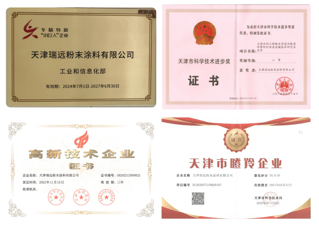 天津瑞遠,自2008年成立以來,便深耕于粉末涂料的研發(fā)、生產(chǎn)與銷售,成為目前國內重防腐涂料行業(yè)規(guī)模最大、品種最齊全的生產(chǎn)廠家。公司的發(fā)展歷程,是一部不斷突破與創(chuàng)新的歷史。從最初的專業(yè)研究到如今的行業(yè)龍頭,天津瑞遠用17年的堅守與努力,鑄就了防腐粉末涂料領域的標桿地位。同時榮獲國家級高新技術企業(yè)、國家級小巨人企業(yè)、天津市綠色工廠,2025年大型水利工程項目獲天津市科技進步二等獎。