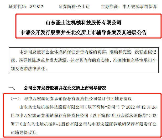 2022年12月27日,山東圣士達機械科技股份有限公司(簡稱:圣士達)對外發(fā)布《申請公開發(fā)行股票并在北交所上市輔導(dǎo)備案及其進展公告》。