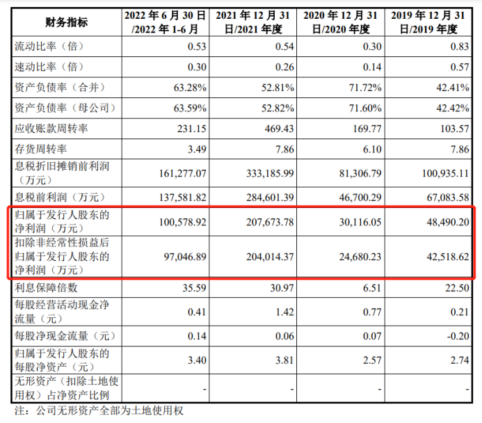 財(cái)報(bào)顯示,2019 年、2020 年、2021 年和 2022 年 1-6 月,海灣化學(xué)扣除非經(jīng)常性損益后的歸屬于母公司股東的凈利潤(rùn)分別為4.25億元、2.47億元、20.4億元和 9.7億元,整體呈上升態(tài)勢(shì)。