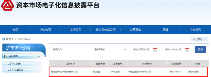 近日,據(jù)證監(jiān)會(huì)網(wǎng)站披露,青島海灣化學(xué)股份有限公司(下稱(chēng)“海灣化學(xué)”) 首次公開(kāi)發(fā)行股票的招股說(shuō)明書(shū),擬沖刺上交所IPO上市。