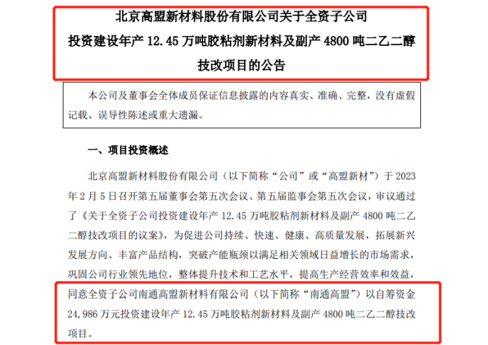 2023年2月6日,北京高盟新材料股份有限公司(以下簡稱“高盟新材”)對外發(fā)布公告稱,公司5日召開第五屆董事會第五次會議、第五屆監(jiān)事會第五次會議,審議通過了《關(guān)于全資子公司投資建設(shè)年產(chǎn)12.45萬噸膠粘劑新材料及副產(chǎn)4800噸二乙二醇技改項目的議案》。