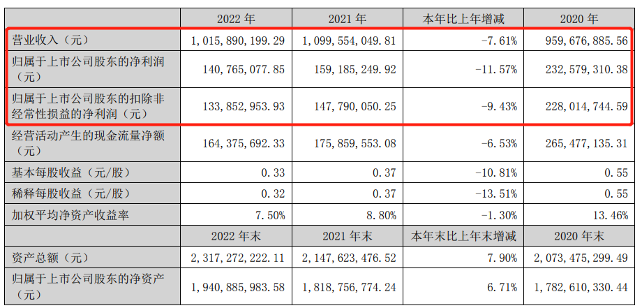 年報(bào)中指出,2022年全年,高盟新材實(shí)現(xiàn)營業(yè)收入10.16億元,與上年相比減少8366.39萬元,降幅為7.61%;實(shí)現(xiàn)營業(yè)利潤1.61億元,與上年相比減少1880.74萬元,降幅為10.47%;實(shí)現(xiàn)歸屬上市公司股東的凈利潤1.41億元,與上年相比減少1842.02萬元,降幅為11.57%。