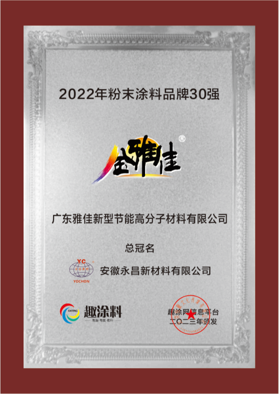 雅佳粉末以國內(nèi)外著名企業(yè)、知名公司等中高端用戶為客戶目標(biāo),致力于各種功能型粉末涂料的研發(fā)。十余年來,公司聚集了一支專業(yè)從事粉末涂料的研發(fā)、生產(chǎn)、技術(shù)服務(wù)和企業(yè)管理的優(yōu)秀團(tuán)隊,他們具備優(yōu)秀的專業(yè)素養(yǎng),精湛的專業(yè)技術(shù)和豐富的實(shí)踐經(jīng)驗;擁有國內(nèi)自動化和信息化程度最高的生產(chǎn)設(shè)備、電腦自動配色系統(tǒng)和一流的檢測檢驗系統(tǒng)。并與多個科研院校建立產(chǎn)學(xué)研基地,成功引入國外先進(jìn)的制粉技術(shù),開發(fā)出一系列產(chǎn)品。為客戶提供持續(xù)的,完整的,盡善盡美的解決方案是雅佳的追求。2018年1月份正式入圍2018年中國自主品牌特別關(guān)注行動。并作為紀(jì)念中國改革開放40周年活動,雅佳粉末代表中國民族品牌參與了在美國時代廣場的展播活動。