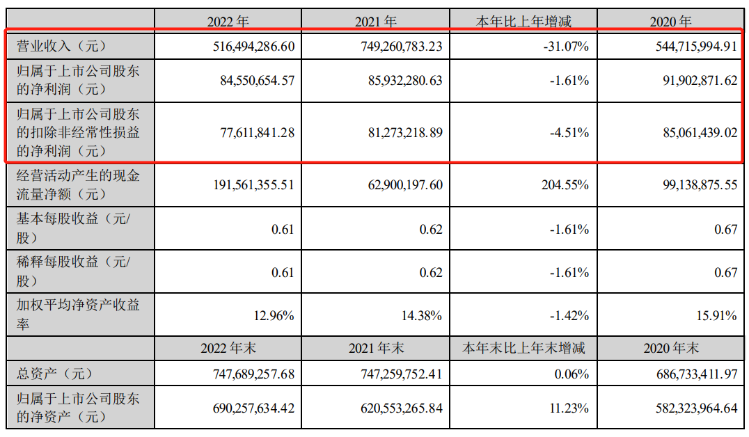 受國(guó)內(nèi)外經(jīng)濟(jì)形勢(shì)變化、安全環(huán)保管控、原材料價(jià)格波動(dòng)、人民幣匯率變化、市場(chǎng)供求關(guān)系等因素影響,洪匯新材2022年經(jīng)營(yíng)業(yè)績(jī)亦受到了一定的影響。公司實(shí)現(xiàn)營(yíng)業(yè)收入5.16億元,同比下降31.07%;歸屬于上市公司股東的凈利潤(rùn)為8455.07萬(wàn)元,同比下降1.61%。