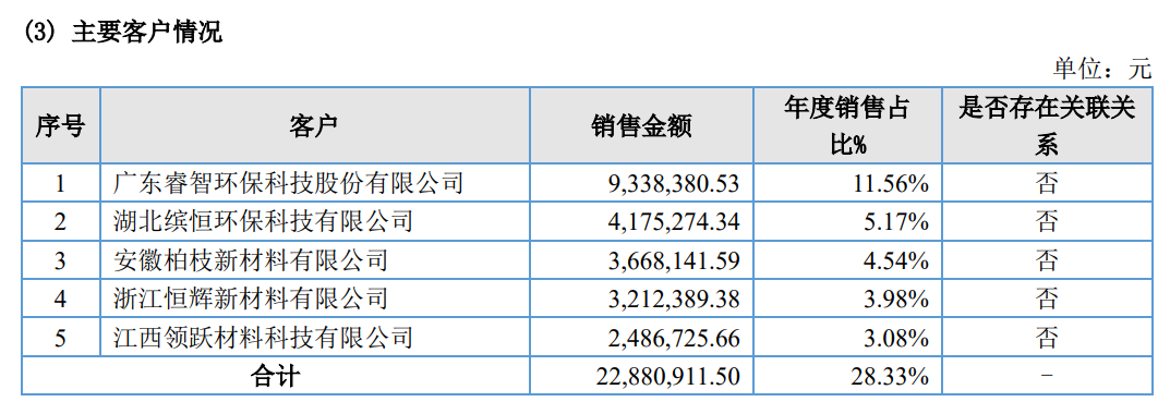 粉末涂裝機械銷售是公司目前業(yè)務(wù)收入的主要來源。根據(jù)披露,圣士達2022年主要客戶有廣東睿智環(huán)??萍脊煞萦邢薰荆?33.84萬元)、湖北繽恒環(huán)??萍加邢薰荆?17.53萬元)、安徽柏枝新材料有限公司(366.81萬元)、浙江恒輝新材料有限公司(321.24萬元)、江西領(lǐng)躍材料科技有限公司(248.67萬元)。