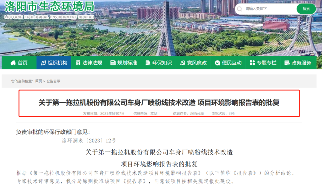 2023年6月07日,洛陽市生態(tài)環(huán)境局對(duì)外發(fā)布《關(guān)于第一拖拉機(jī)股份有限公司車身廠噴粉線技術(shù)改造 項(xiàng)目環(huán)境影響報(bào)告表的批復(fù)》。