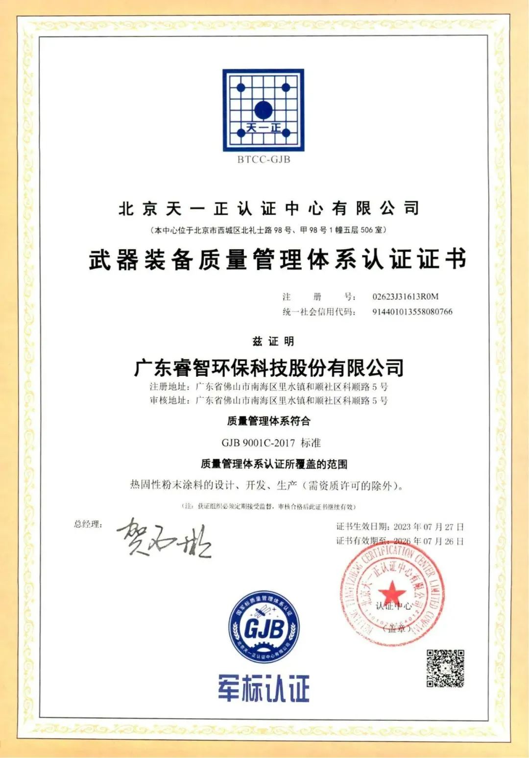 國(guó)軍標(biāo)質(zhì)量管理體系認(rèn)證(GJB9001C-2017)為中華人民共和國(guó)國(guó)家軍用標(biāo)準(zhǔn),由中央軍委裝備發(fā)展部批準(zhǔn)發(fā)布。依據(jù)《武器裝備質(zhì)量管理?xiàng)l例》相關(guān)規(guī)定,作為企業(yè)承擔(dān)軍工產(chǎn)品生產(chǎn)任務(wù)的必備資質(zhì),國(guó)軍標(biāo)質(zhì)量管理體系認(rèn)證的條件十分嚴(yán)格。此次認(rèn)證能夠順利通過(guò),表明睿智在熱固性粉末涂料的設(shè)計(jì)、開(kāi)發(fā)、生產(chǎn)水平已達(dá)到國(guó)家軍用標(biāo)準(zhǔn),具備了軍用熱固性粉末涂料的產(chǎn)品研發(fā)、生產(chǎn)和服務(wù)的能力。