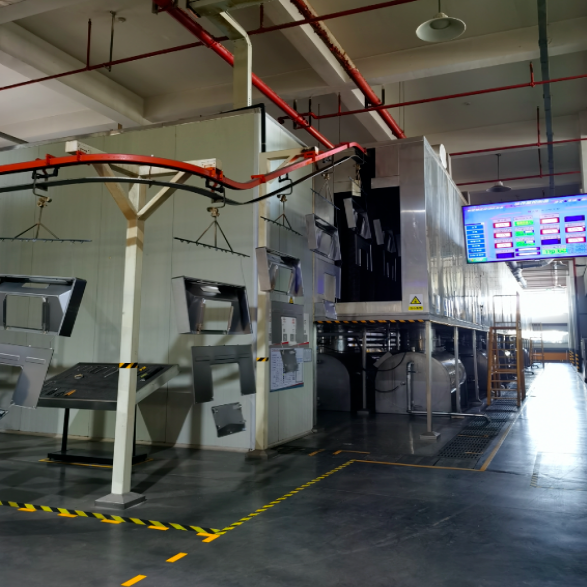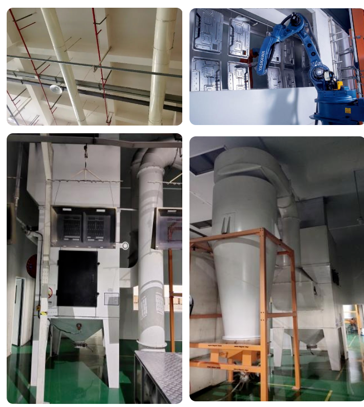 除此之外,企業(yè)設(shè)有綠色高效的噴塑作業(yè)生產(chǎn)線。噴塑前采用硅烷化處理,與傳統(tǒng)磷化相比,不含有害重金屬離子和磷,無需加溫。噴塑工序采用高壓靜電高效噴涂技術(shù),全程由機(jī)器人自動(dòng)化運(yùn)行,粉末涂料的使用率高,減少環(huán)境污染。噴塑廢氣收集采用粉末回收系統(tǒng)處理,系統(tǒng)配備無接觸式噴房底板清洗系統(tǒng)、高效率大旋風(fēng)裝置和高效過濾器,具有不易粘塵、濾芯使用壽命長(zhǎng)、回收利用率高的優(yōu)點(diǎn),除塵效果大幅提升。