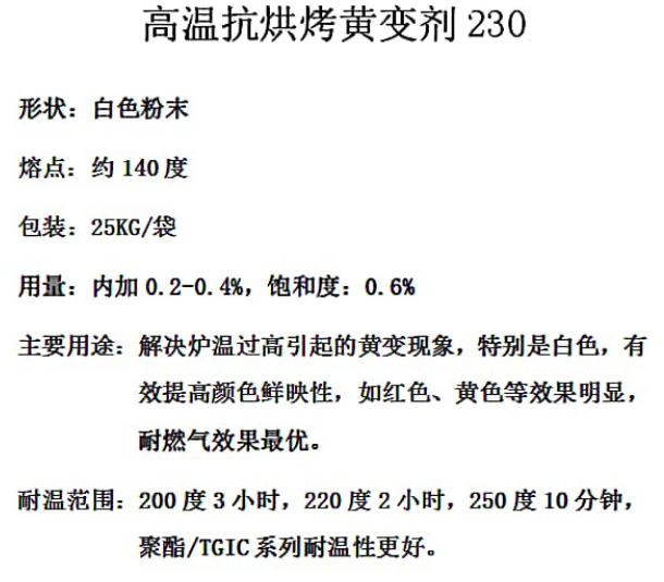 燃氣爐抗黃變劑可有效避免和減輕粉末涂料在燃氣爐中烘烤固化時,涂層中的組份被高溫下的少量氧化性氣體氧化而出現黃變現象,導致涂層的色差大,加入燃氣爐抗黃變劑230可以避免和減輕該現象。