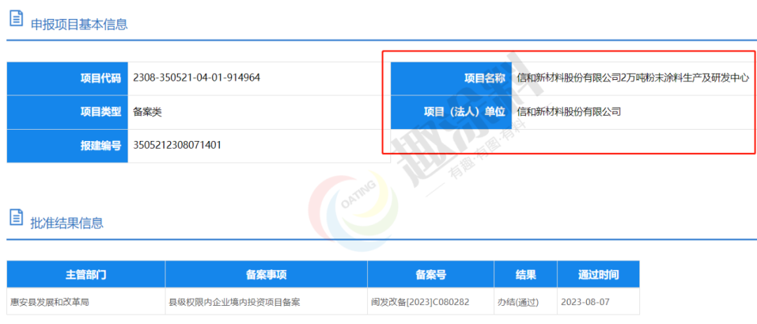 2023年8月7日,信和新材料股份有限公司,2萬噸粉末涂料生產及研發(fā)中心,在惠安縣發(fā)展和改革局,進行縣級權限內企業(yè)境內投資項目備案。
